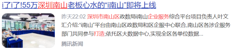 11月14日,深圳市南山區政數局、南山區企業(yè)發(fā)展服務(wù)中心聯(lián)合召開(kāi)了i南山企業(yè)服務(wù)綜合平臺媒體通氣會(huì ),作為深圳市南山區服務(wù)企業(yè)的總平臺、招商引資的主陣地——i南山企業(yè)服務(wù)綜合平臺即將上線(xiàn),將覆蓋近55萬(wàn)家南山市場(chǎng)主體,實(shí)現永遠在線(xiàn)的企業(yè)服務(wù);對標全國全球優(yōu)質(zhì)項目,開(kāi)展永不落幕的招商引資。會(huì )后,深圳新聞網(wǎng)、新浪新聞、騰訊新聞等各大媒體紛紛報道。